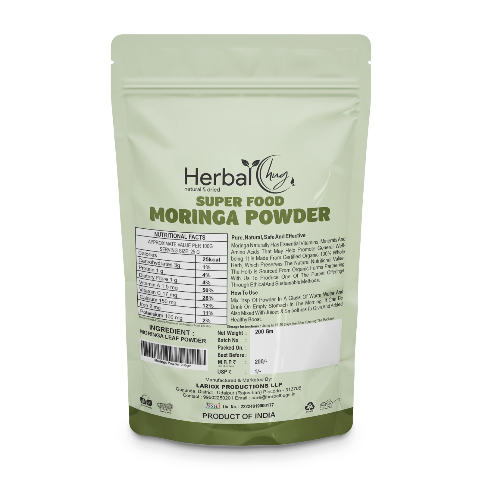 - 100% Organic & Vegan: Herbal Hug Moringa Churna Is 100% Organic, Vegan, And Ecocert Certified. The Moringa Churna Is Free From Chemicals, And Preservatives And Is Brought To You In Its Purest, Most Effective Form To Enhance Your Health And Impart Overall Wellness.